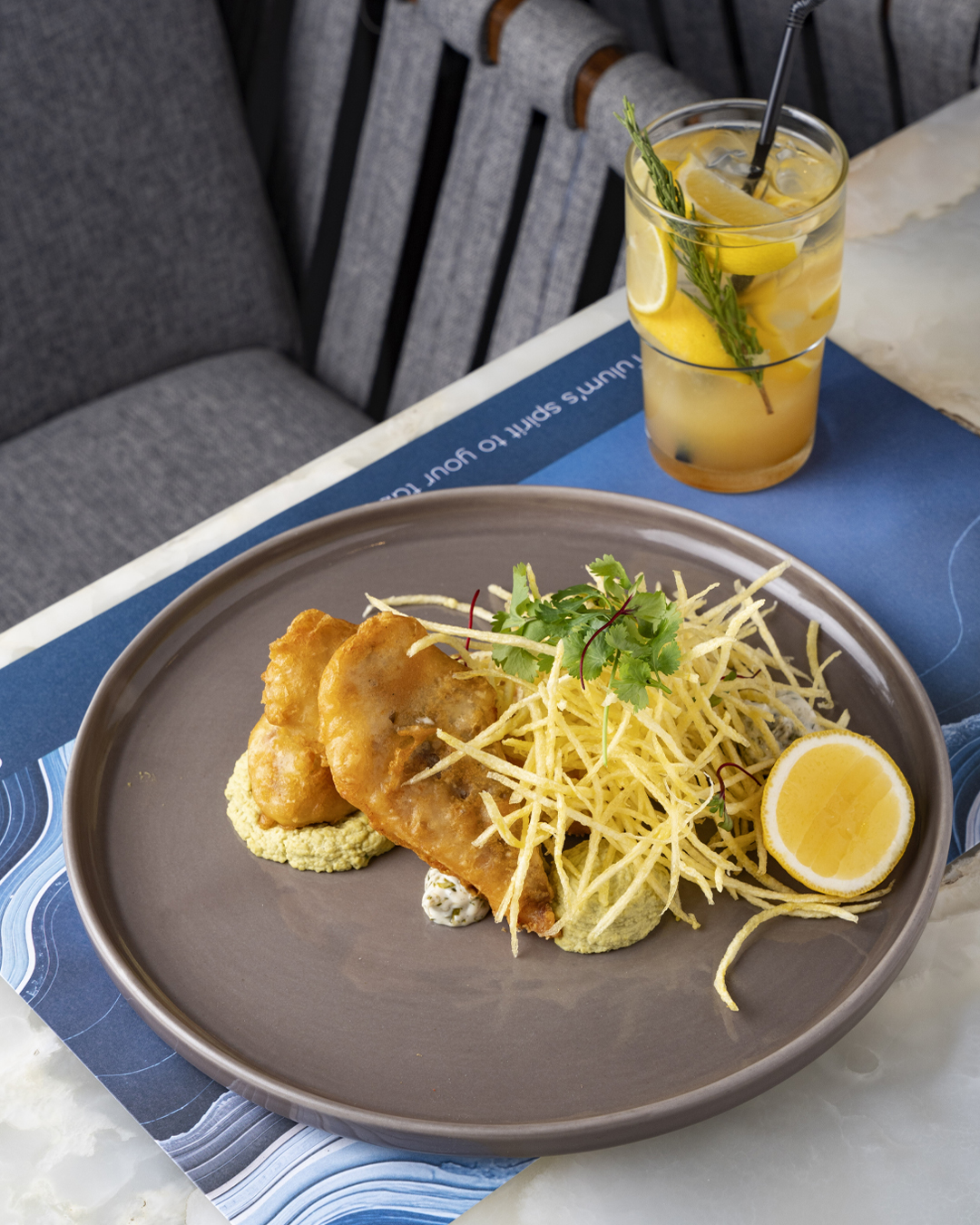 فیله ماهی کفشک، چیپس سیب زمینی، حمص نخود فرنگی و سس تارتار
