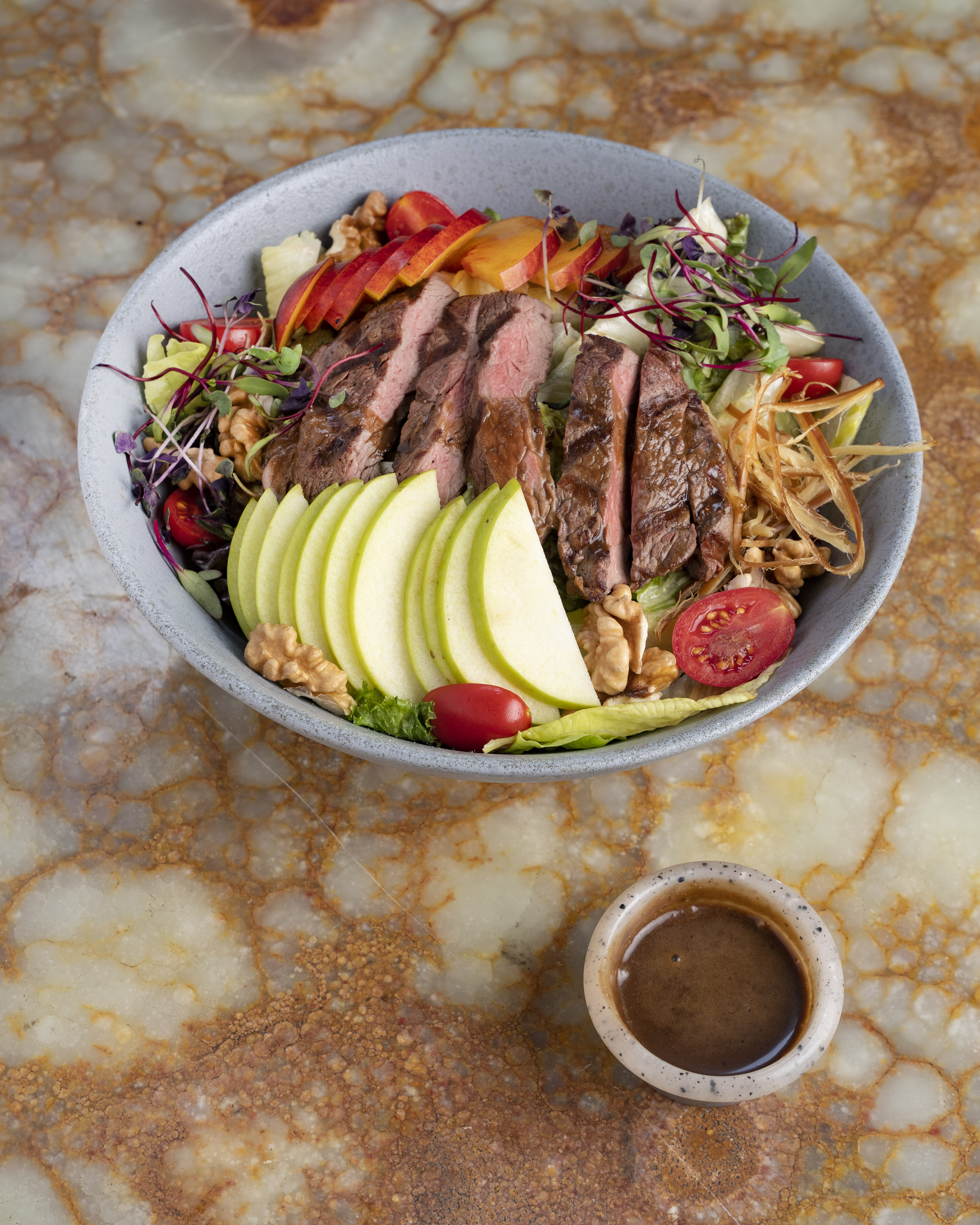 فیله گوساله گریل، گردو، لیتل جم، کاهو رسمی و فرانسوی،چیمی چوری، میوه فصل،درسینگ لیمو